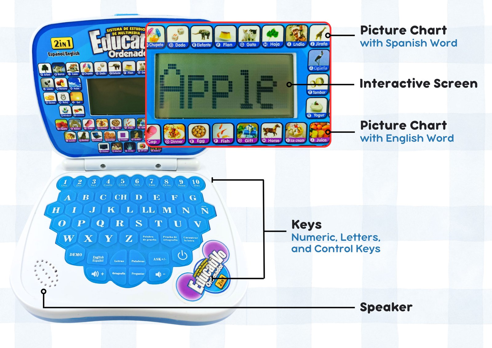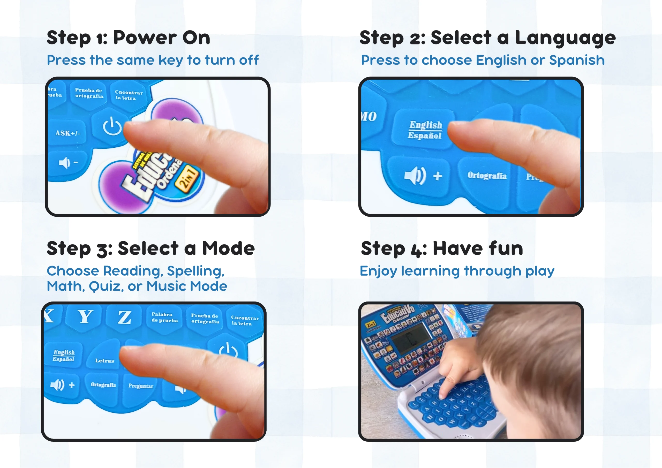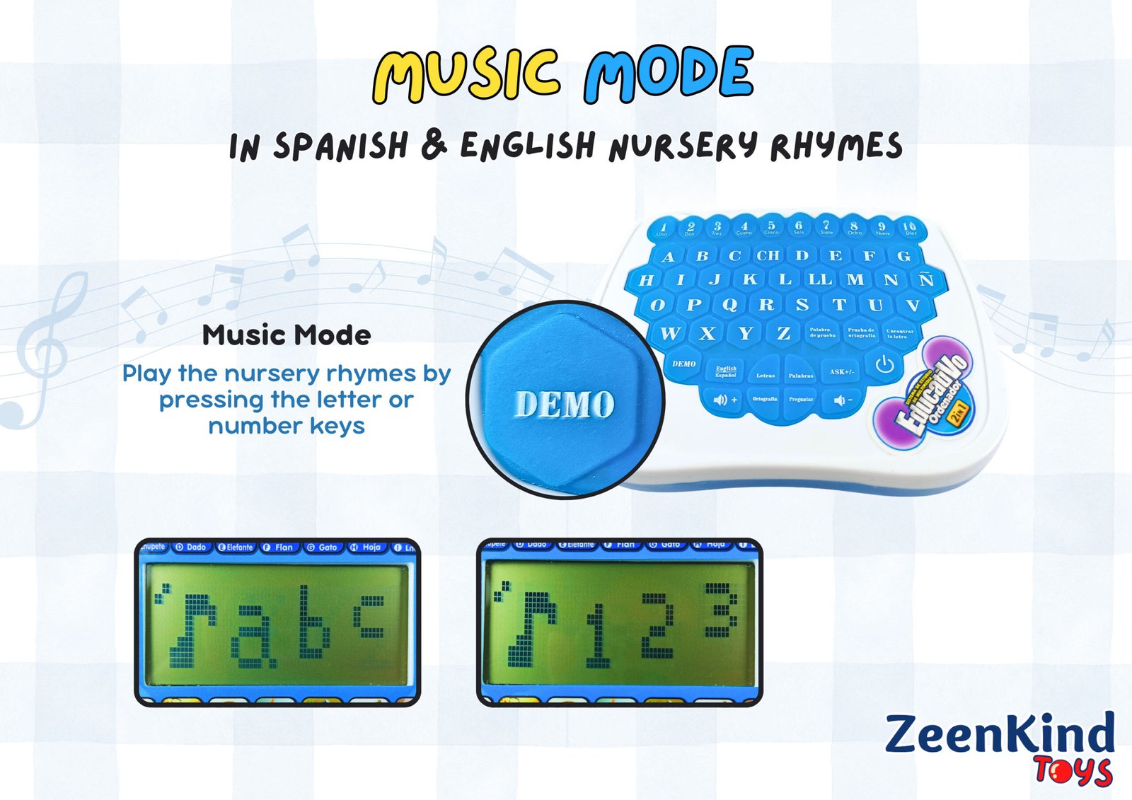 support@zeenkind.com www.zeenkind.com ZeenKindSpanish & English Laptop Toy User Guide View in PDF View Youtube Video